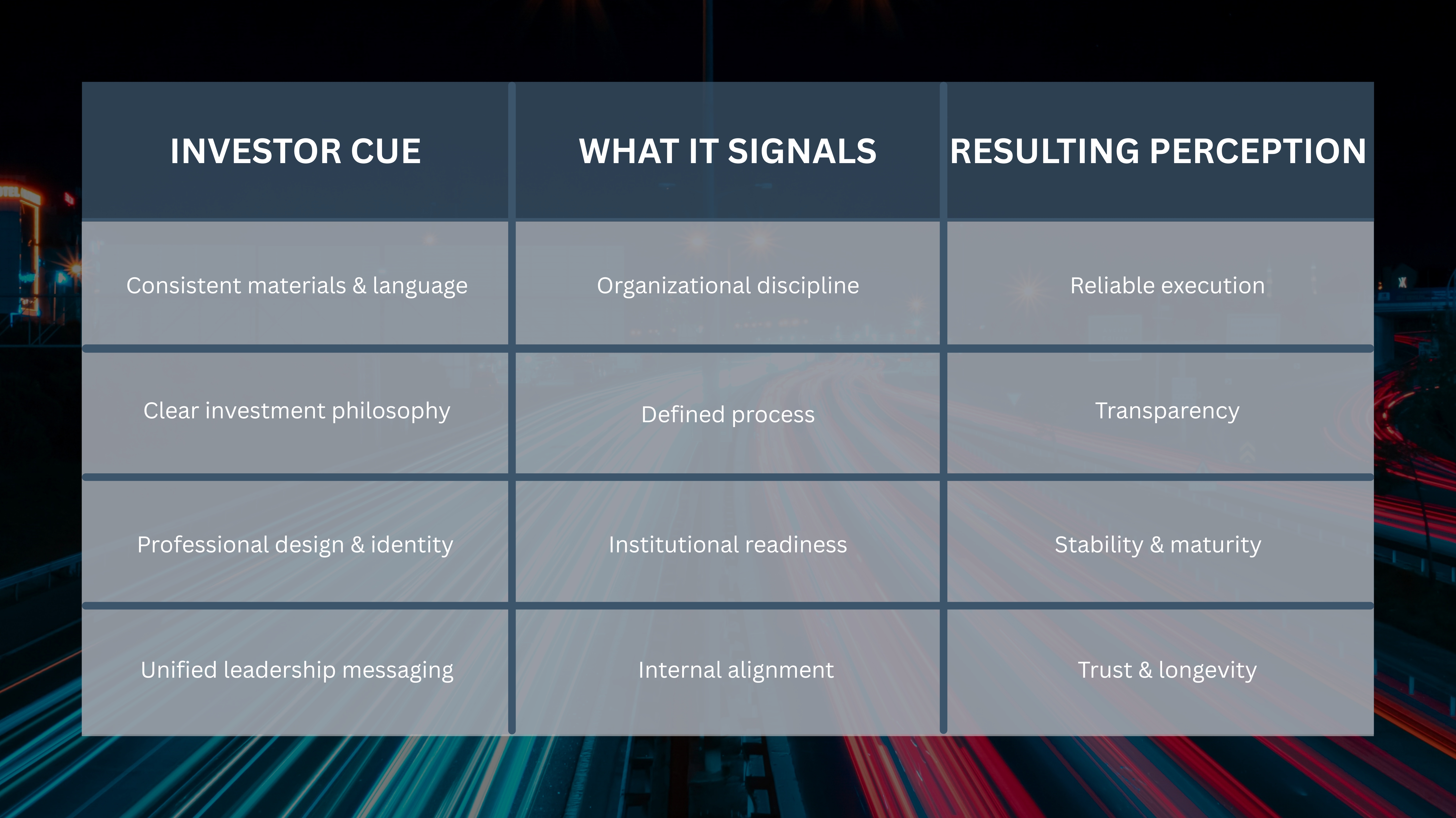 Instead, investors infer them from what they can see: how a firm defines itself, how consistent its materials are, and how confidently it communicates.